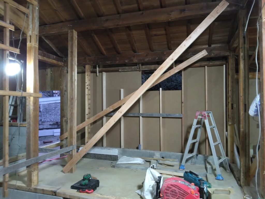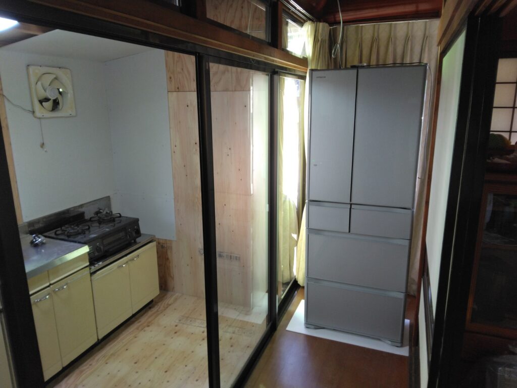 縁側の外に合板で仮台所、しばらくは不便ですが、よろしくお願いします。